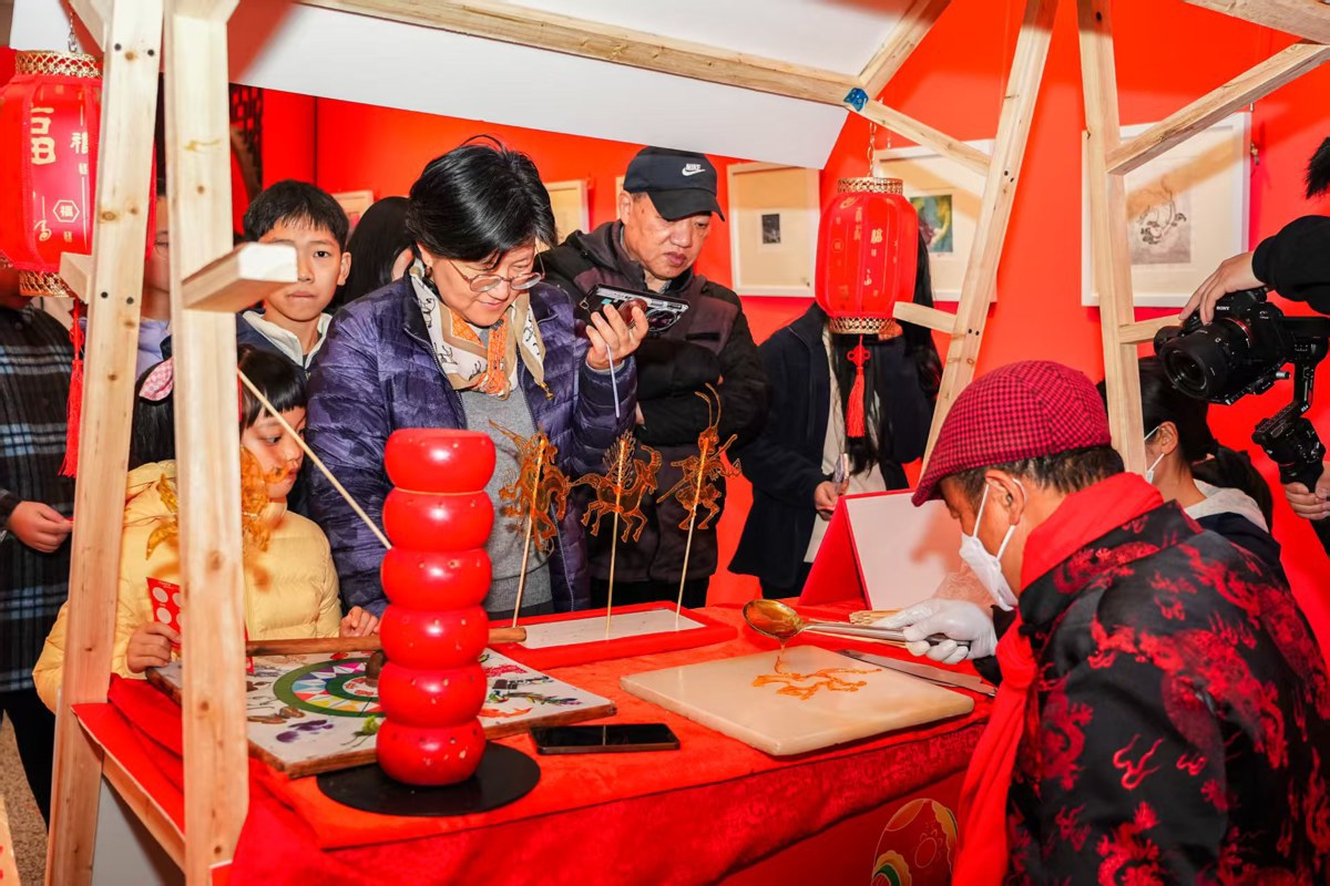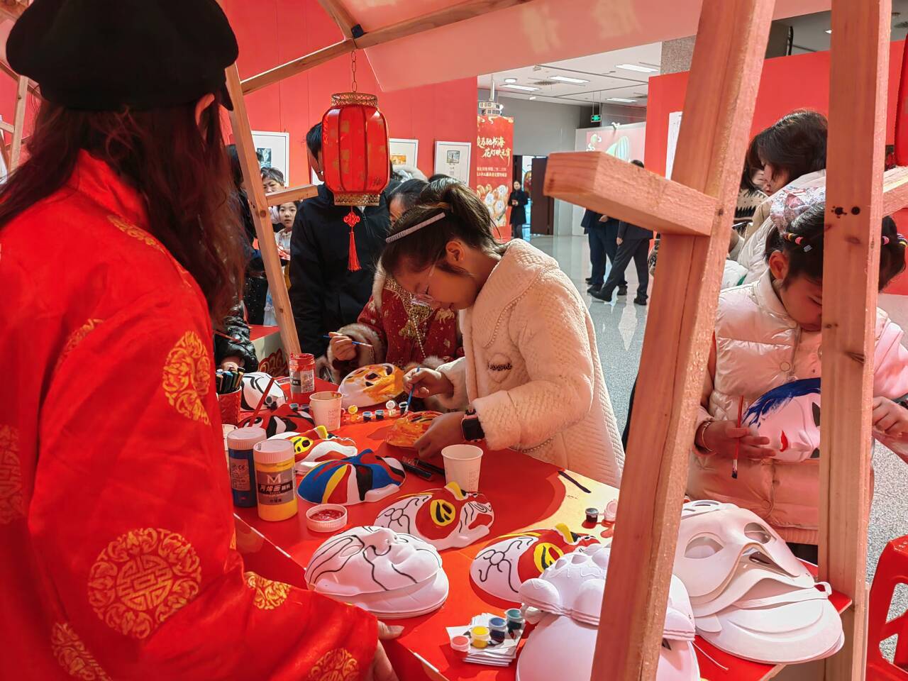 当日,省图书馆一楼东厅化身为热闹的民俗工坊。在漆扇制作区,孩子们亲手将素白的扇面浸入五彩斑斓的水面,提起瞬间便形成独一无二的漆扇。一旁的投壶区域传来阵阵欢声笑语,每一次箭矢入壶的清脆声响,都引来一片喝彩,传统游戏的礼仪与趣味尽在其中。脸谱绘制桌前,孩子们在老师指点下一笔一画勾勒着忠奸善恶的鲜明轮廓,于色彩与线条间触摸国粹的深邃内涵。糖画、拓印等共十项民俗活动前都排着长队,深受读者们的喜爱。