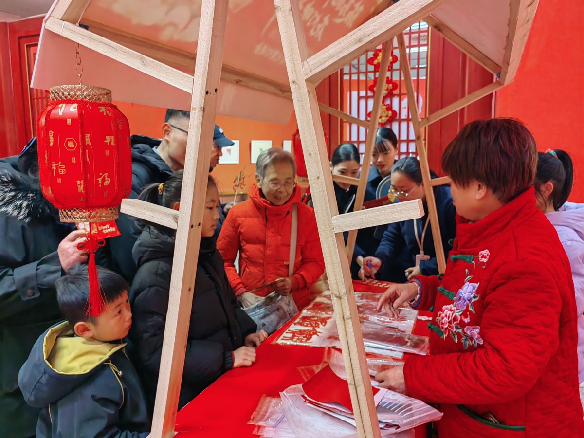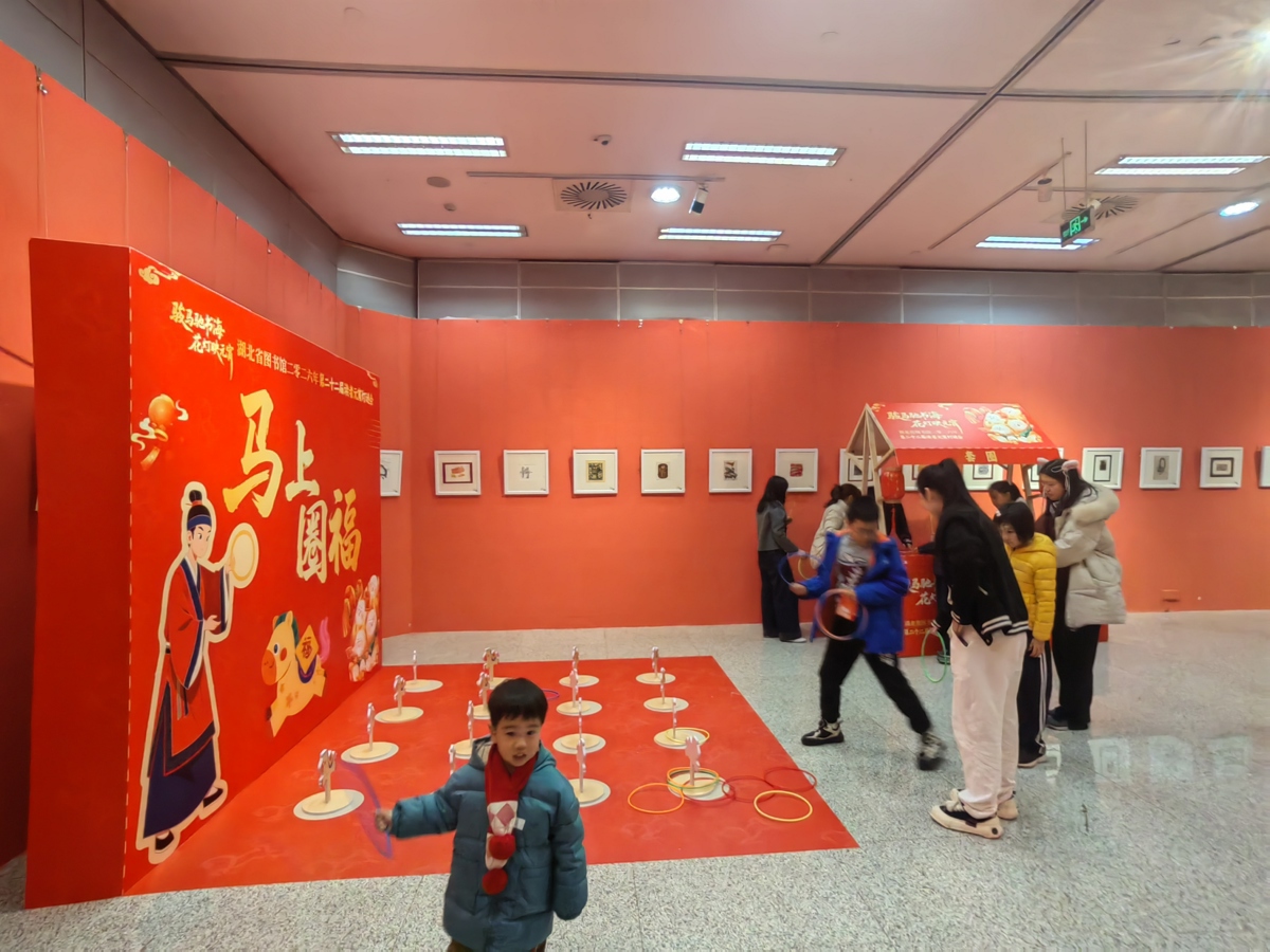移步二楼,“新春习俗文化展”则是一片静谧的天地。展示恩施“抬格子”、武汉“煨汤”等特色年俗的展板前,观众驻足品味这幅绵长的荆楚风物画卷。最引人入胜的是那条谜语长廊,大家或仰首沉吟,或低声交流,在汉字的巧妙迷阵中进行着一场跨越千年的智慧对话。许多读者还在寓意丙午马年奋进的祈福墙前,写下对新年的美好期盼。