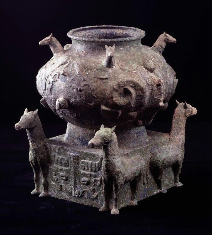 马纹最古老的雏形源自北方游牧族群的岩面刻画,此时的纹样构成简单直接,多以简练粗犷的线条刻画出马的轮廓。商周时期,随着青铜铸造技术与礼乐制度的发展,马被镌刻进青铜礼器,并逐渐从平面走向半浮雕与立体装饰的结合。湖南出土的西周四马方座铜簋,器身肩部饰以四匹伏卧的小马,腹部兽面纹与长冠凤鸟纹相间,器座两侧更铸有相背而立的立马,马尾纹理清晰。其中,器座兽面纹体现了周文化的影响,器身卧马与器座立马纹的造型却在商周青铜器中较为独特,展现出地域风格与中原礼制体系的早期融合。此时的马纹以几何线条重塑身形,从原始的粗犷转向规整,马不再是自然动物,而是礼制体系中的身份标志。