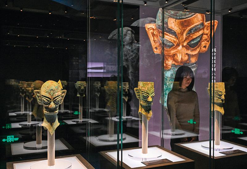 观众在北京中国国家博物馆举办的“双星耀世——三星堆—金沙遗址古蜀文明展”上参观展出的青铜人头像(2026 年 1 月 18 日摄) 金良快摄 / 本刊