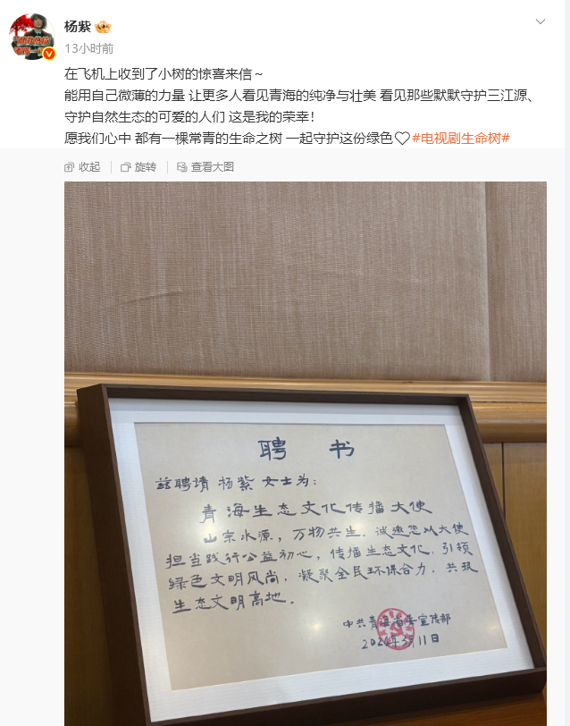 同日晚间,演员杨紫发布微博称,已获聘“青海生态文化传播大使”,并表示:“能用自己微薄的力量,让更多人看见青海的纯净与壮美,看见那些默默守护三江源、守护自然生态的可爱的人们,这是我的荣幸!”