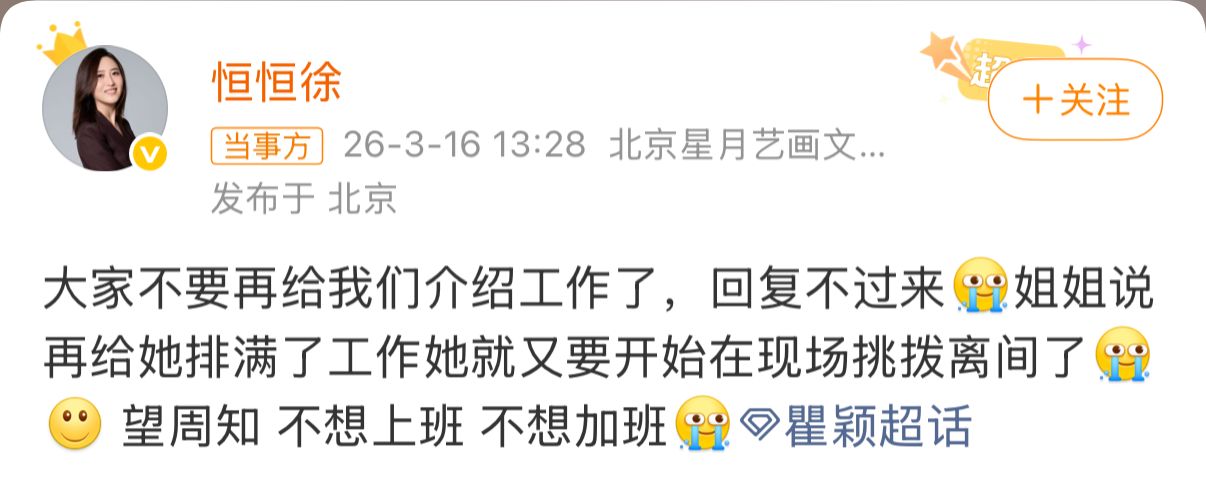 3月16日下午,瞿颖经纪人发文称:大家不要再给我们介绍工作了,回复不过来。