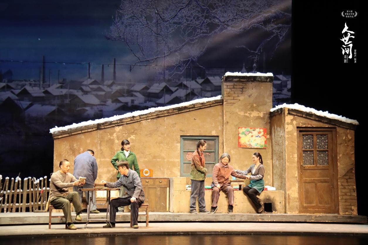 《人世间》在进行第100场演出时,还出现了一个感人至深的一幕:舞台上,当老年的周秉昆骑着板车,载着郑娟缓缓驶向舞台深处,纷纷扬扬的雪花从空中飘落时,原著作者梁晓声现身舞台一侧,朝着远去的主人公挥手致意。这一幕动人场景,让现场许多观众不禁潸然泪下。演出结束后,作家梁晓声登上舞台,与主创和观众交流,“每位演员的表演都令我动容,尤其是饰演郑娟的演员,她的表演让我数次流泪。”梁晓声谈到,《人世间》讲述的是普通劳动者的故事,在这些话剧演员身上,他真实感受到了一种不被大风刮倒的生命韧性,以及相互依偎传递的人性温度。