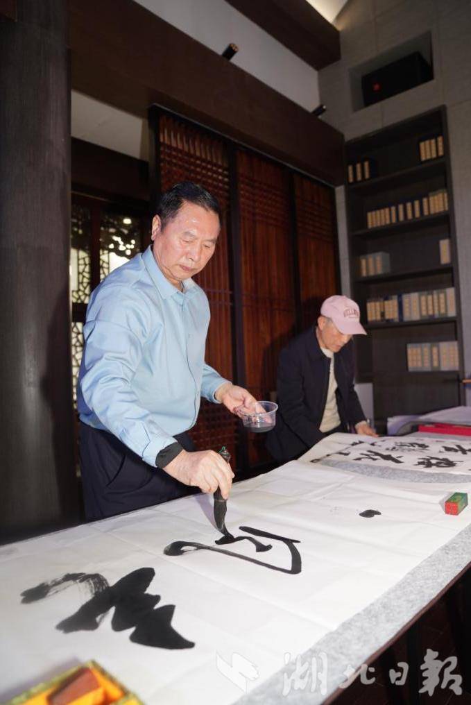 湖北省中华诗词学会樱花诗书画社的艺术家们现场挥毫泼墨,以励志语句及黄鹤楼相关名人诗词为内容,创作出一幅幅书法作品。笔墨之间,既有对传统文化的致敬,也有对春日名楼的礼赞。部分作品后续将通过互动抽奖等形式,赠予樱花季来黄鹤楼游玩的游客,让诗意随春风传递。