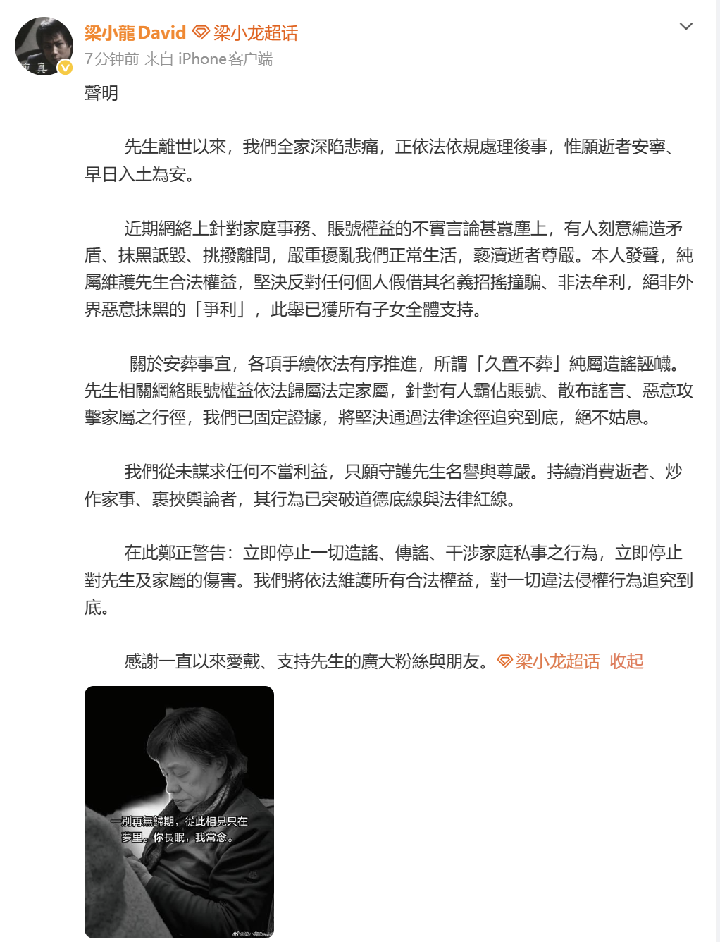 近期网络上针对家庭事务、账号权益的不实言论甚嚣尘上,有人刻意编造矛盾、抹黑诋毁、挑拨离间,严重扰乱我们正常生活,亵渎逝者尊严。本人发声,纯属维护先生合法权益,坚决反对任何个人假借其名义招摇撞骗、非法牟利,绝非外界恶意抹黑的“争利”,此举已获所有子女全体支持。