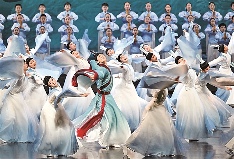 国家大剧院内,演员在舞蹈诗朗诵《离骚·少年志》中表演。新华社发