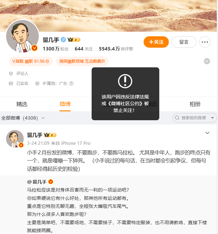 其最新一条微博为3月25日晚所发:“小手2月份发的微博,不要跑步,不要跑马拉松。尤其是中年人,跑步的终点只有一个,就是嘎嘣一下猝死。(小手说过的每句话,在当时都会引起争议,但每句话都经得起历史的检验)”
