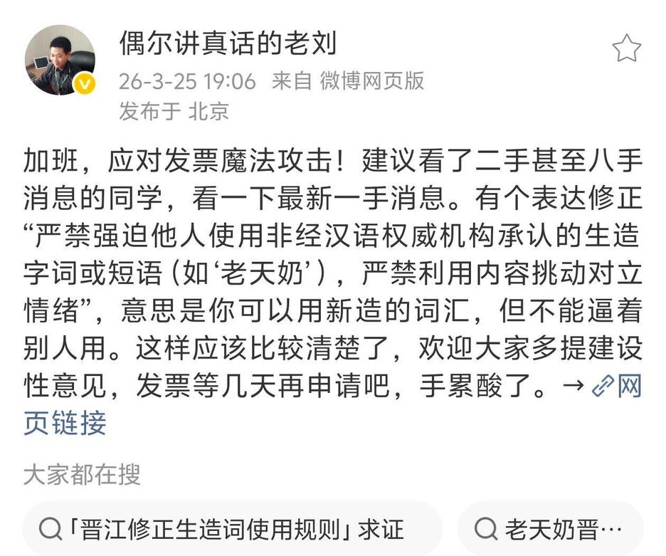 3月25日晚,晋江副总裁发文称开发票属于“魔法攻击”,再次引发争议。他强调将相关表达修正为“严禁强迫他人使用非经汉语权威机构承认的生造字词或短语(如“老天奶”),严禁利用内容挑动对立情绪”,称可以用新造的词汇,但不能逼着别人用。