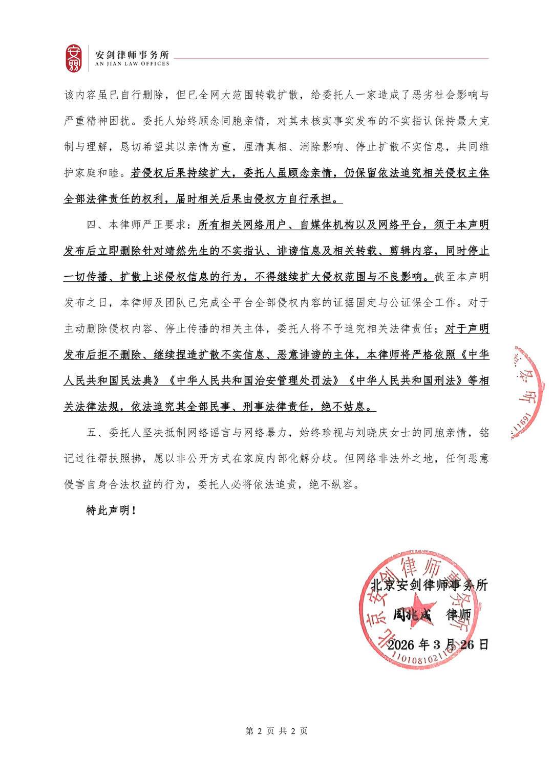 针对此次谣言风波及网络不实指认,3月26日,北京安剑律师事务所周兆成律师接受刘晓红、靖然共同委托,对外发布正式律师声明,全面回应相关名誉侵权问题。