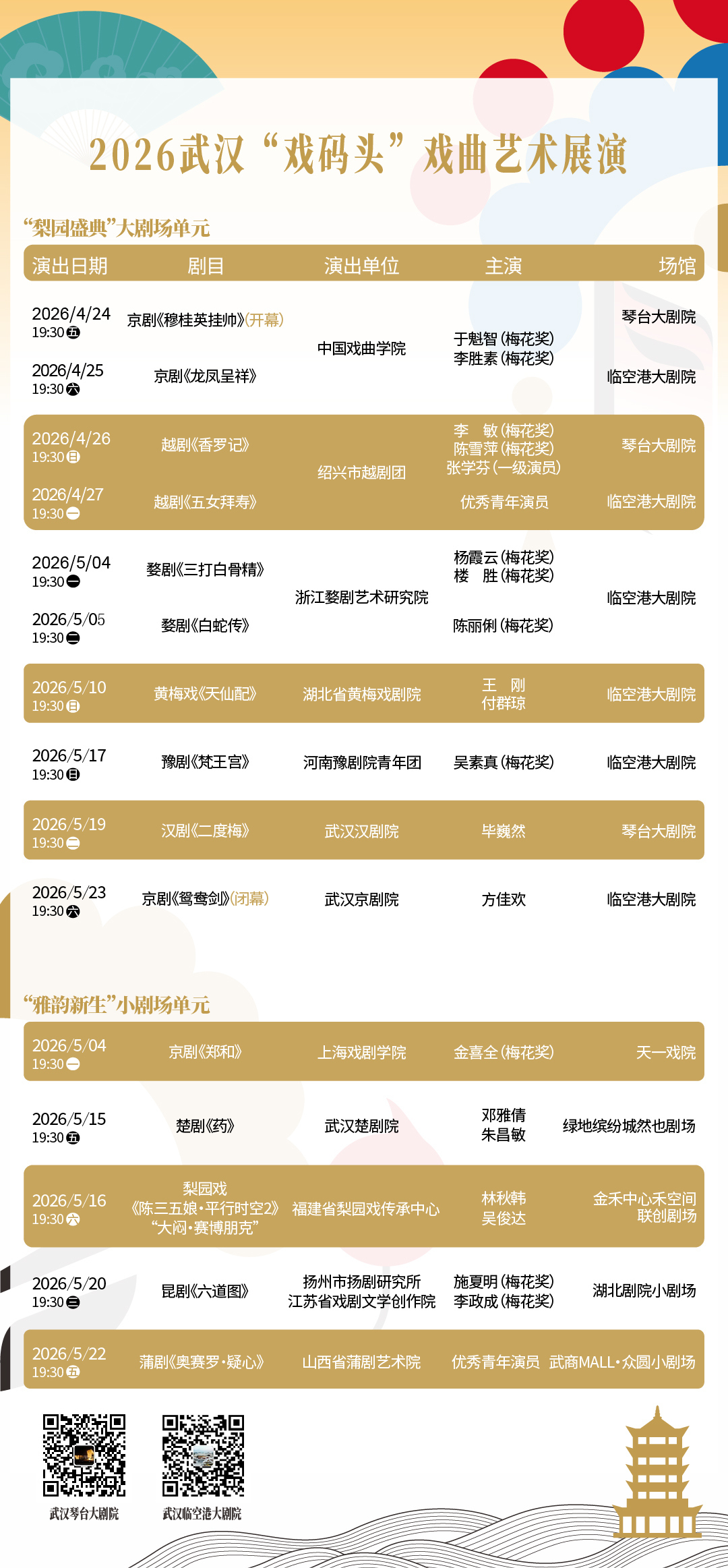 新闻记者了解到,4月24日至5月23日,由武汉市人民政府主办,中共武汉市委宣传部、武汉市文化和旅游局承办,武汉琴台大剧院、临空港大剧院、武汉楚剧院等单位执行的2026武汉“戏码头”戏曲艺术展演将精彩亮相。