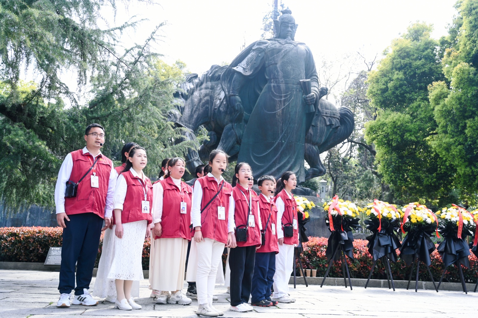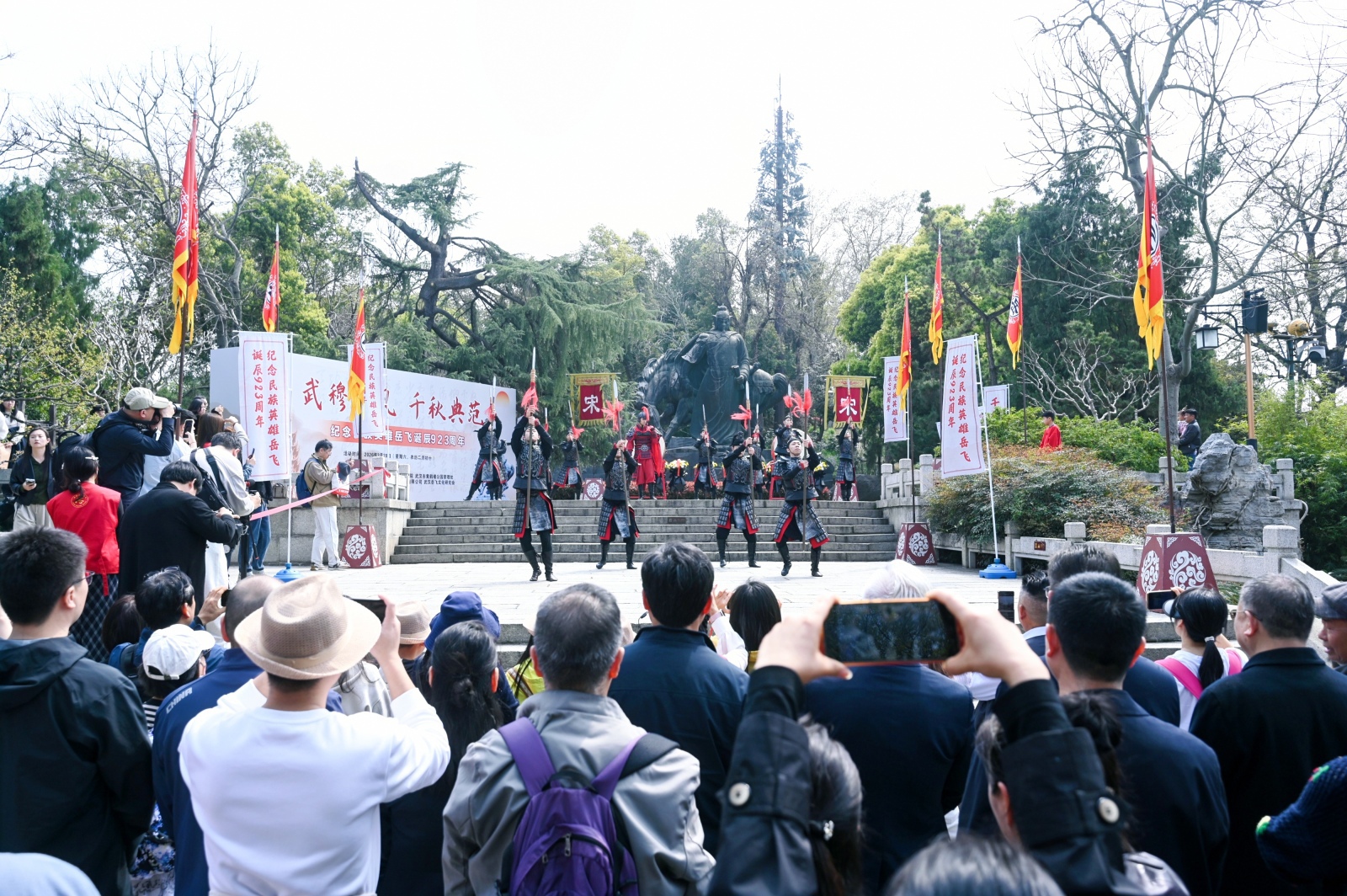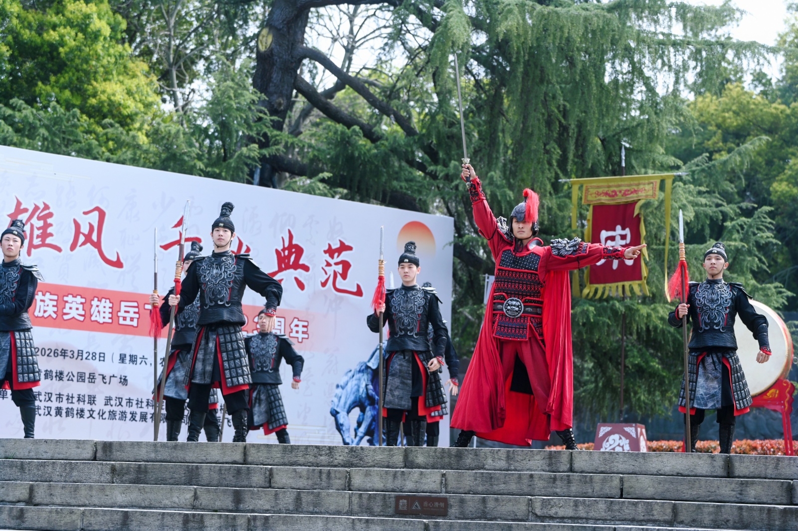 当天活动现场,在奏唱国歌之后,相关单位代表依次向岳飞铜像敬献花篮,全体参与人员行三鞠躬礼,并绕行岳飞铜像一周,表达对英雄的崇高敬意和无限缅怀。黄鹤楼文化志愿者带来的岳飞词作朗诵,以及现场沉浸式情景节目《精忠报国》等,则以艺术形式再现了岳飞的家国情怀与英雄气概。