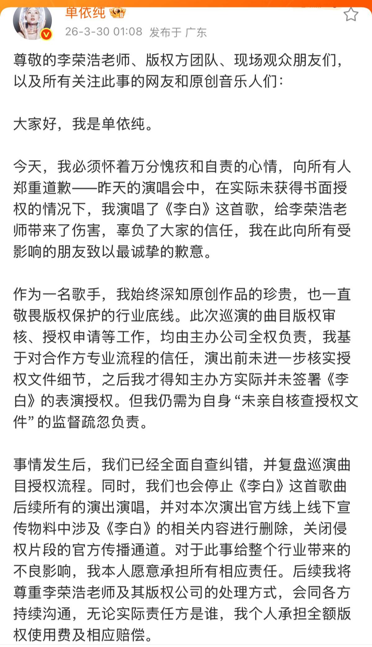3月30日凌晨,被李荣浩喊话“强行侵权”的单依纯在深圳演唱会结束后发出长文,就未获书面授权而演唱李荣浩的歌曲《李白》再度致歉。