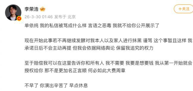 单依纯发文38分钟后,李荣浩回应,自己不需要单依纯的赔偿:“我要是想要钱,我从一开始就会授权给你,那不是更加名正言顺?何必如此大费周章。”