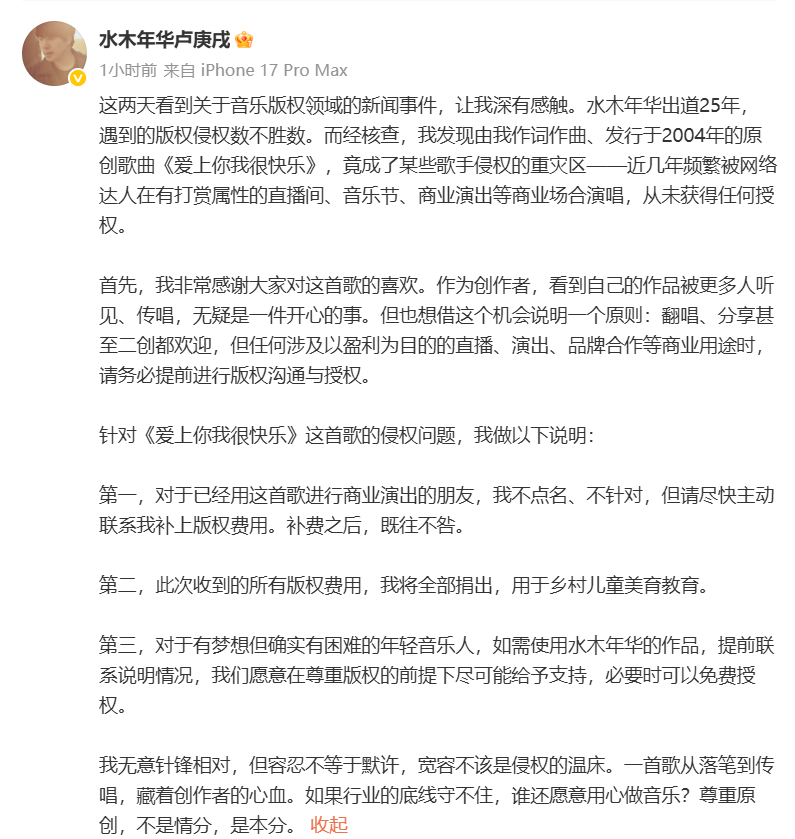 3月30日,水木年华卢庚戌发文就2004年的原创歌曲《爱上你我很快乐》遭遇侵权发文,称近几年频繁被网络达人在有打赏属性的直播间、音乐节、商业演出等商业场合演唱,从未获得任何授权。