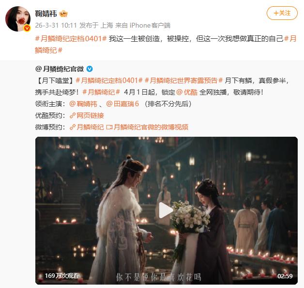 今日(3月31日),鞠婧祎与郭敬明合作的新剧《月鳞绮纪》官宣定档4月1日,鞠婧祎转发相关微博写道:“我这一生被创造,被操控,但这一次我想做真正的自己。”
