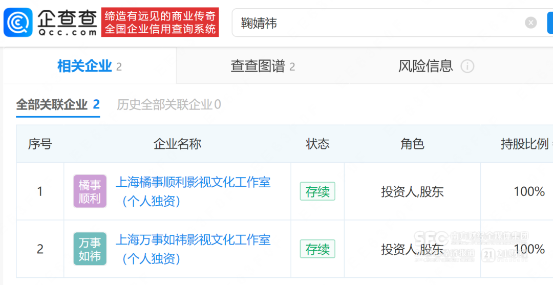 企查查APP显示,目前鞠婧祎已成立2家个人独资工作室,名称分别为橘事顺利、万事如祎。其姓名商标则被上海丝芭演艺管理有限公司成功注册,涵盖餐饮住宿、教育娱乐、乐器等类别,本人并未持有相关商标。