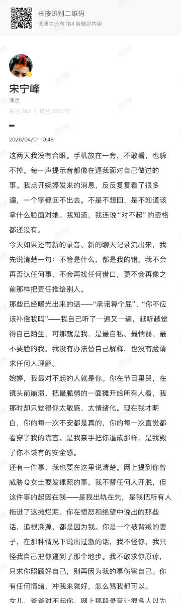 刚刚,被狗仔曝出与出轨对象Q女士录音的演员宋宁峰 发布长文,坦言出轨事件属实。在长文中他提到,录音里是“最自私、最懦弱、最不要脸的我”,更称自己最对不起的人是妻子张婉婷,“现在我才明白,你的每一次不安都是真的,你的每一次直觉都看穿了我的谎言,是我亲手把你逼成那样。”