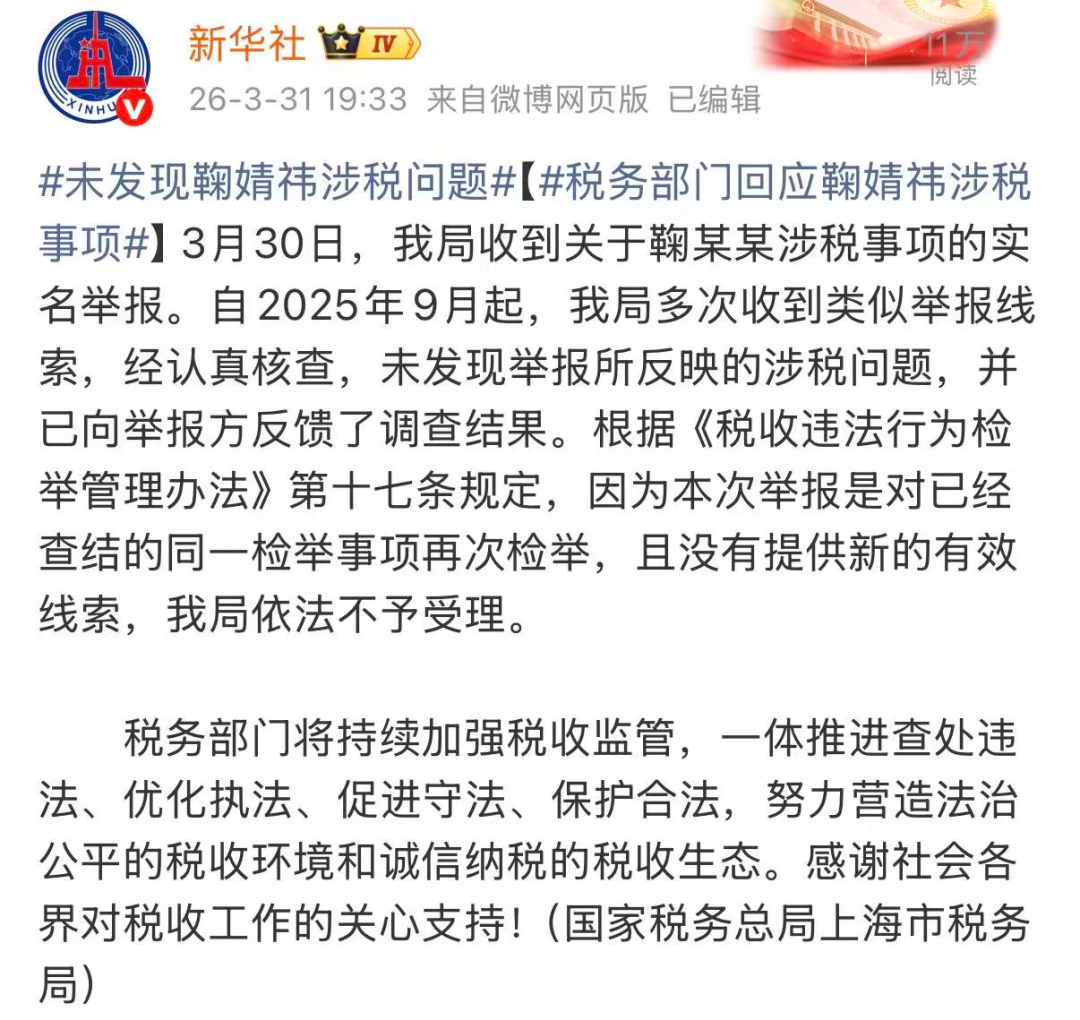 3月31日晚,税务部门回应鞠婧祎偷税事项: