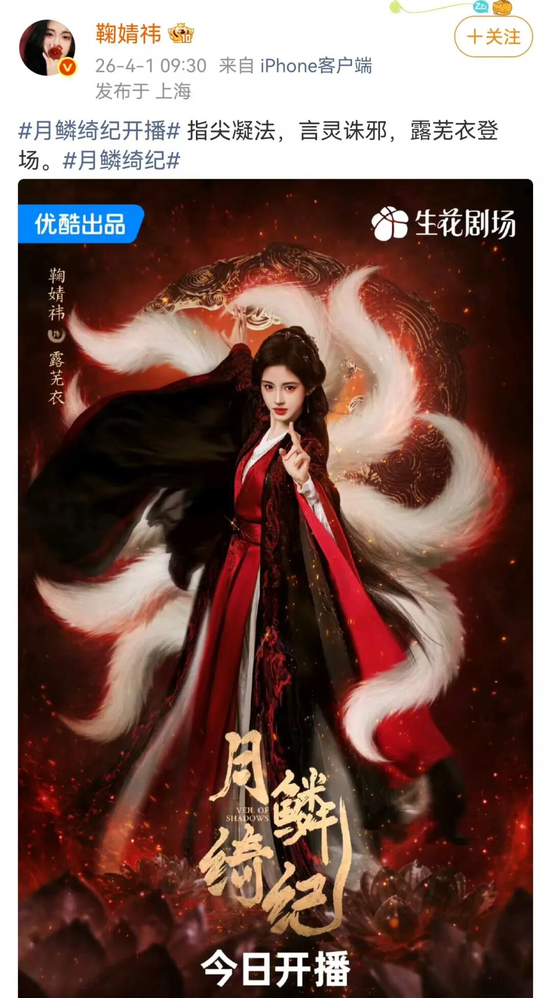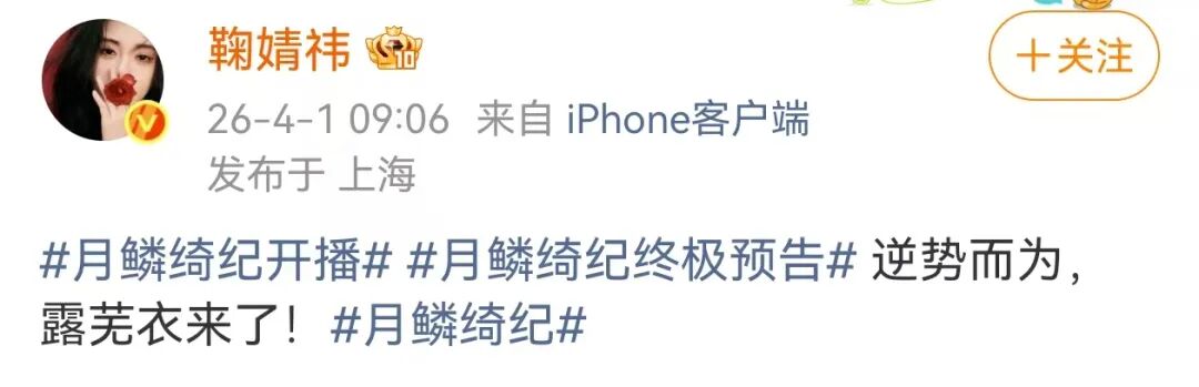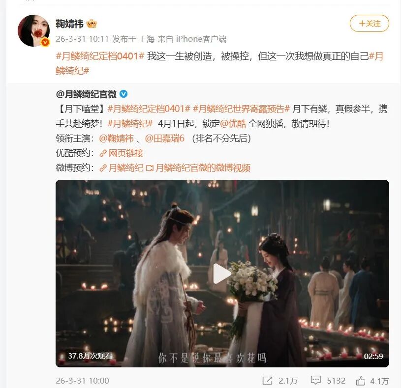 3月31日上午,鞠婧祎更新动态,转发了新剧《月鳞绮纪》相关内容,并配文:我这一生被创造,被操控,但这一次我想做真正的自己。
