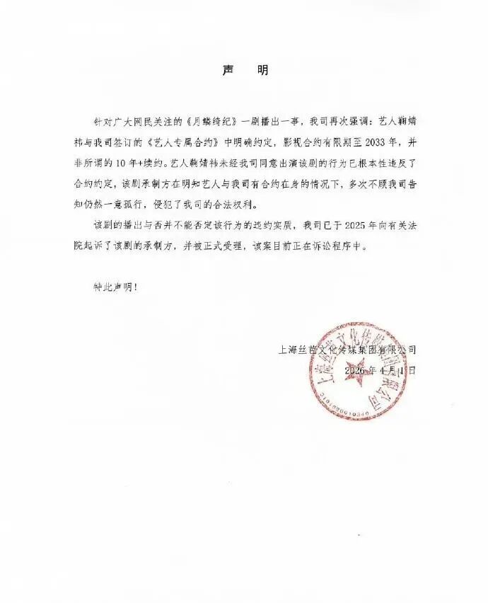 针对广大网民关注的《月鳞绮纪》一剧播出一事,我司再次强调:艺人鞠婧祎与我司签订的《艺人专属合约》中明确约定,影视合约有限期至2033年,并非所谓的10年+续约。艺人鞠婧祎未经我司同意出演该剧的行为已根本性违反了合约约定,该剧承制方在明知艺人与我司有合约在身的情况下,多次不顾我司告知仍然一意孤行,侵犯了我司的合法权利。