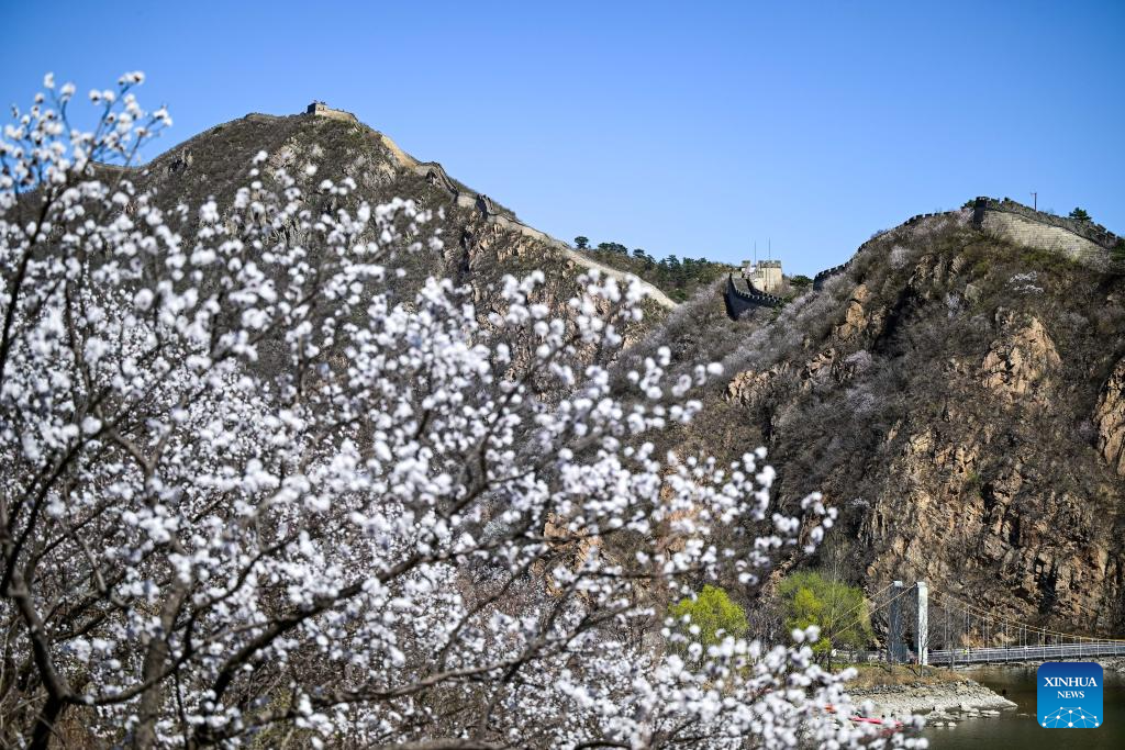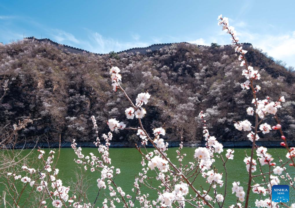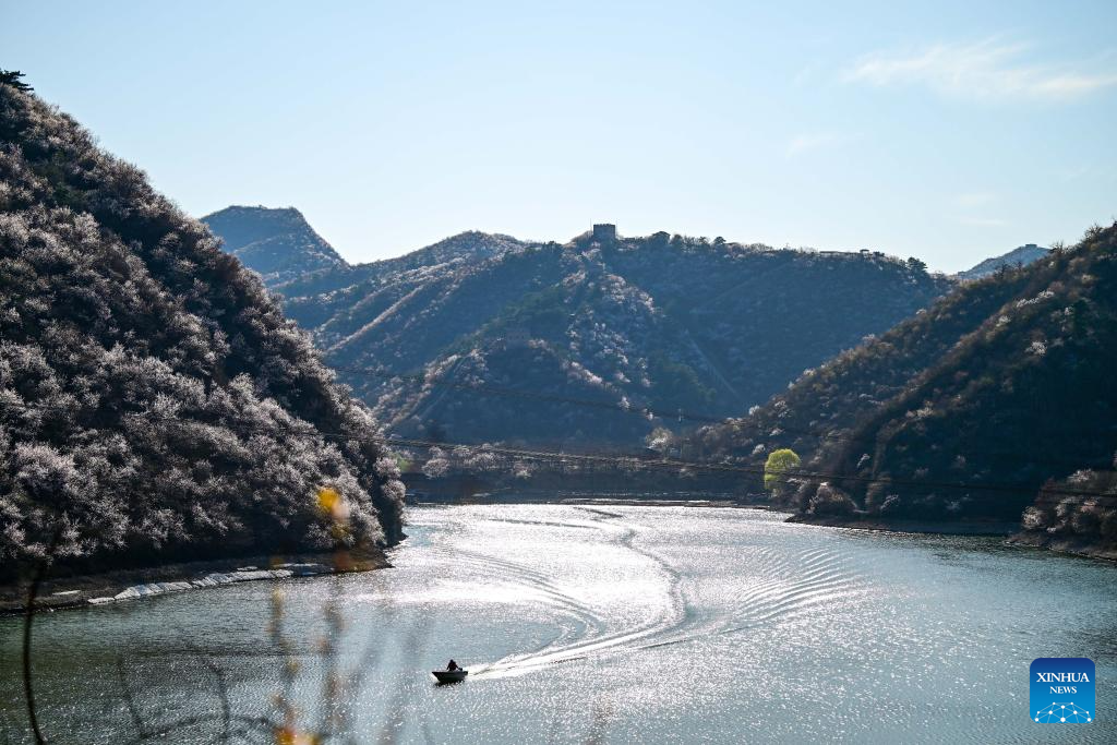 This photo taken on April 1, 2026 shows blooming flowers at Huanghuacheng Lakeside Great Wall in Huairou District of Beijing, capital of China. (Xinhua/Chen Yehua)