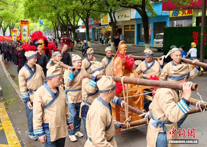 4月2日,湖南永州零陵古城,祭祀队伍抬送柳宗元塑像前往柳子庙举行公祭仪式。陈斌 摄