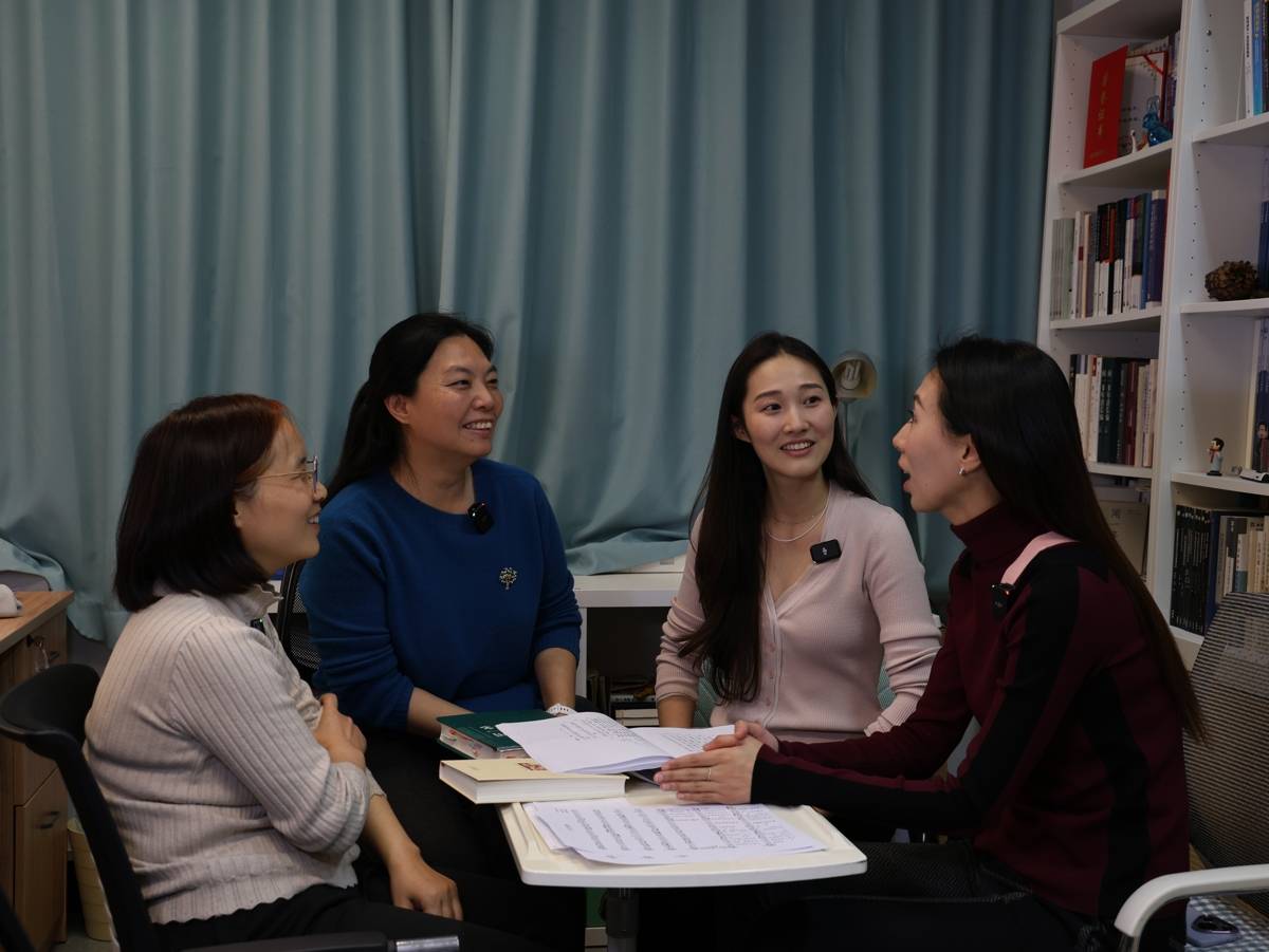 何玲、闻亭、金珂宇、张姣正在探讨曲谱复原。(湖北日报全媒记者 刘毅 摄)