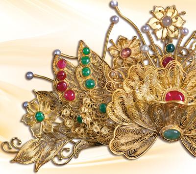 雁鸿制作的花丝蝴蝶牡丹冠。该作品采用成都银花丝制作技艺,由足银制成。