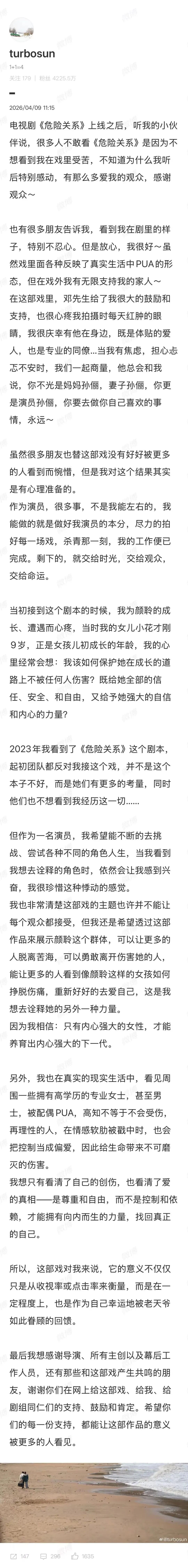 4月9日,孙俪通过个人微博发文回应新剧《危险关系》收视不佳的问题,表示对结果早有心理准备。她坦言作为演员能做的就是尽职完成表演,在杀青那一刻工作已经结束,后续的收视、点击和传播则交给观众与命运。