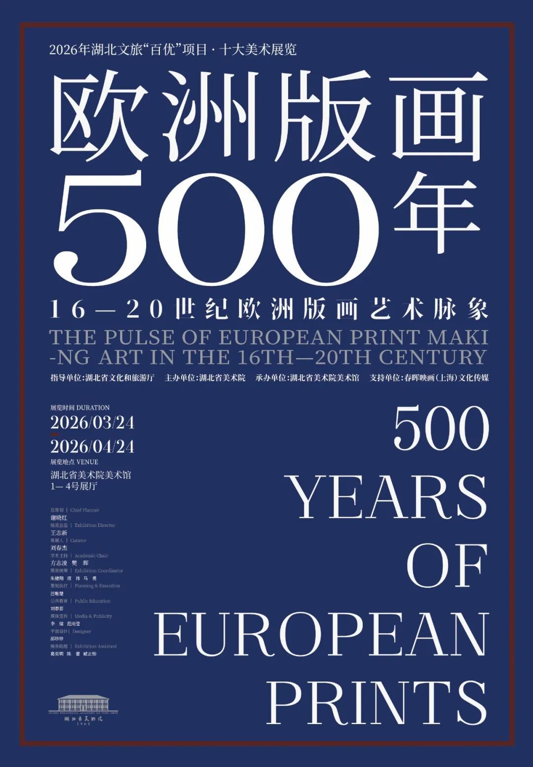 2026年4月10日,由湖北省文化和旅游厅指导、湖北省美术院主办、湖北省美术院美术馆承办、春晖映画(上海)文化传媒支持的“欧洲版画500年——16-20世纪欧洲版画艺术脉象”展览在湖北省美术院美术馆启幕。