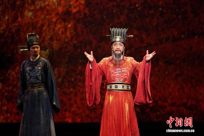 4月10日,北京人民艺术剧院话剧《张居正》在香港西九文化区戏曲中心大剧院上演。图为该剧导演兼主演冯远征饰演的张居正(右)在演出中。 中新网记者 张祥毅 摄