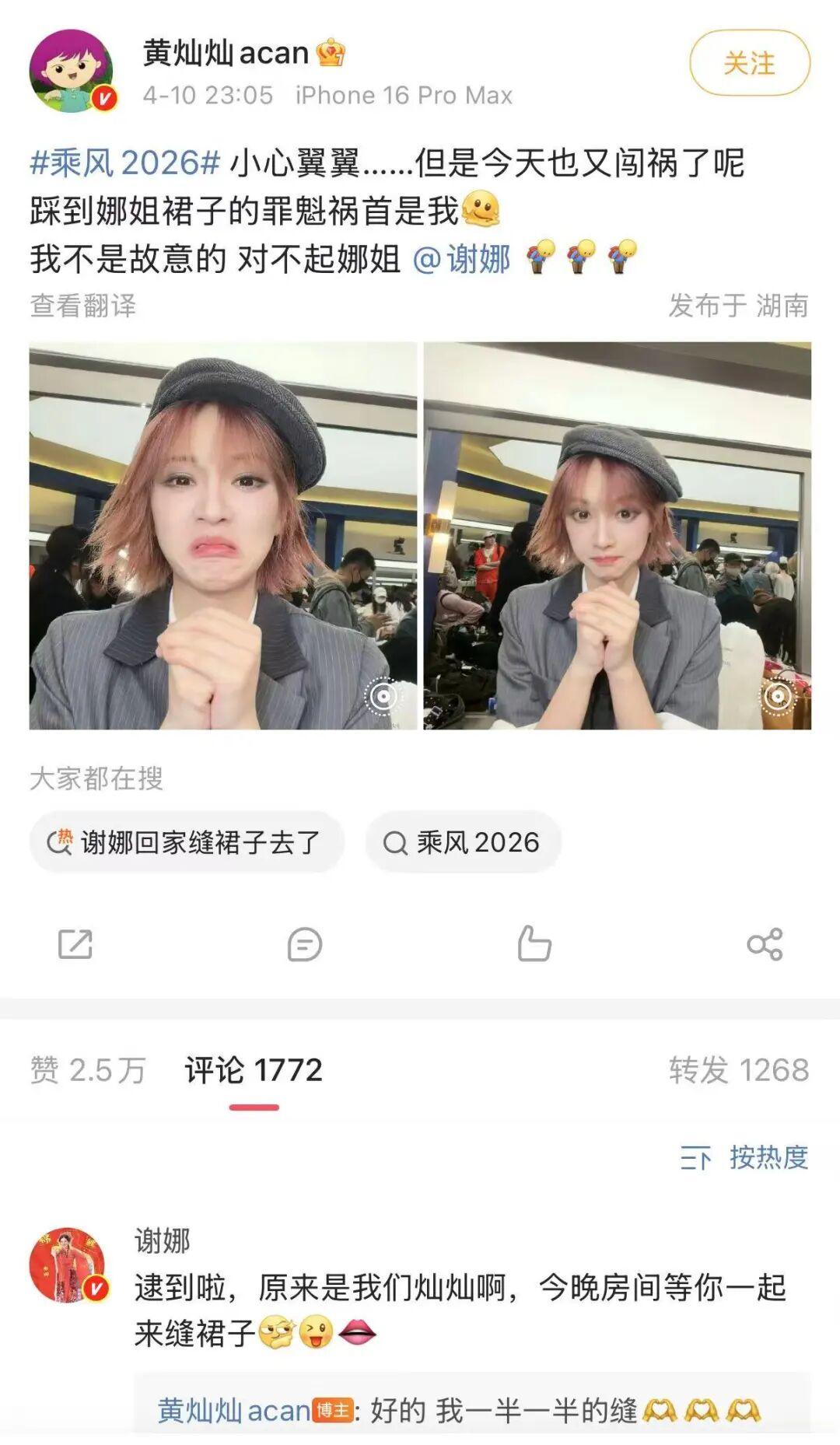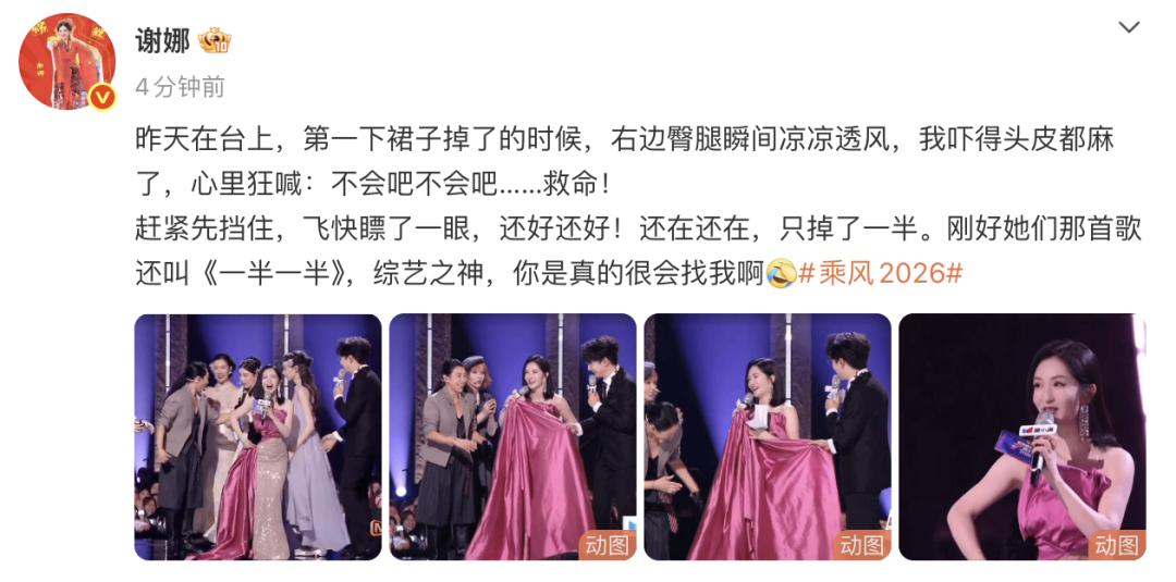 4月10日晚乘风2026一公直播,现场突发小插曲,主持人谢娜的裙子突然被踩掉了。10日晚,黄灿灿还特别发文向谢娜道歉,谢娜幽默回应:晚上一起缝裙子,黄灿灿也幽默回复:一半一半地缝。当晚她与曾沛慈、淡淡表演的唱跳歌曲就是《一半一半》。