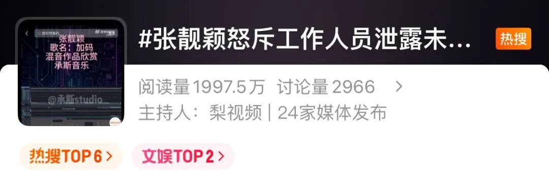 4月11日,话题“张靓颖怒斥工作人员泄露未发行作品”冲上热搜。