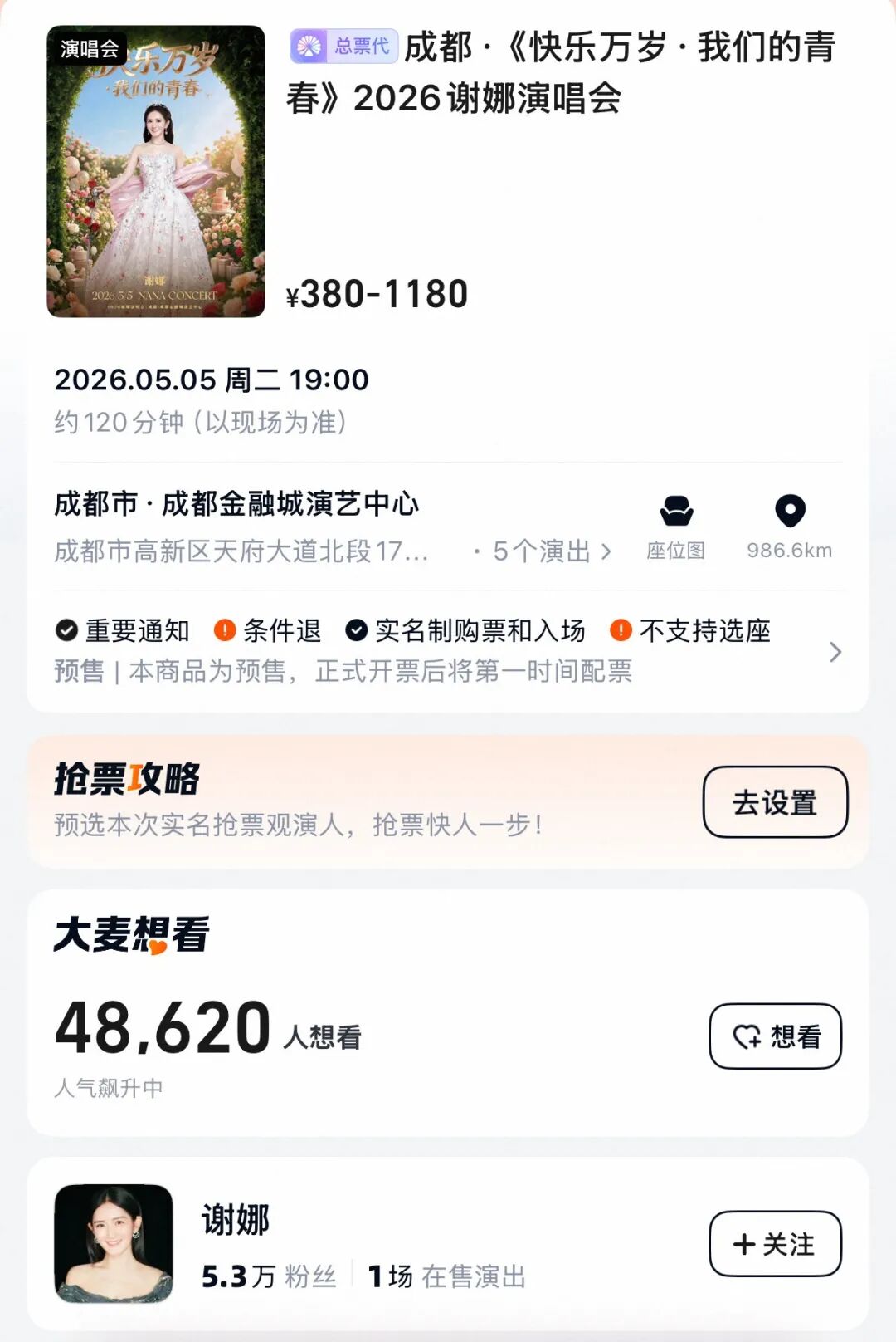 新闻记者注意到,谢娜个人演唱会成都站截至发稿时想看人数已超4.8万,票价380元至1180元不等。据悉,谢娜曾在2月的直播中表示:“我那些歌也要拿出来见人了。”