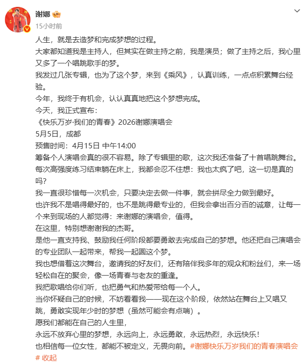 4月11日,谢娜在《乘风2026》直播中官宣开演唱会。随后,@谢娜发长文回应:筹备个人演唱会真的很不容易。除了专辑里的歌,这次我还准备了十首唱跳舞台。也许我不是唱得最好的,也不是跳得最专业的,但我会拿出百分百的诚意,让每一个来到现场的人都觉得:来谢娜的演唱会,值得。