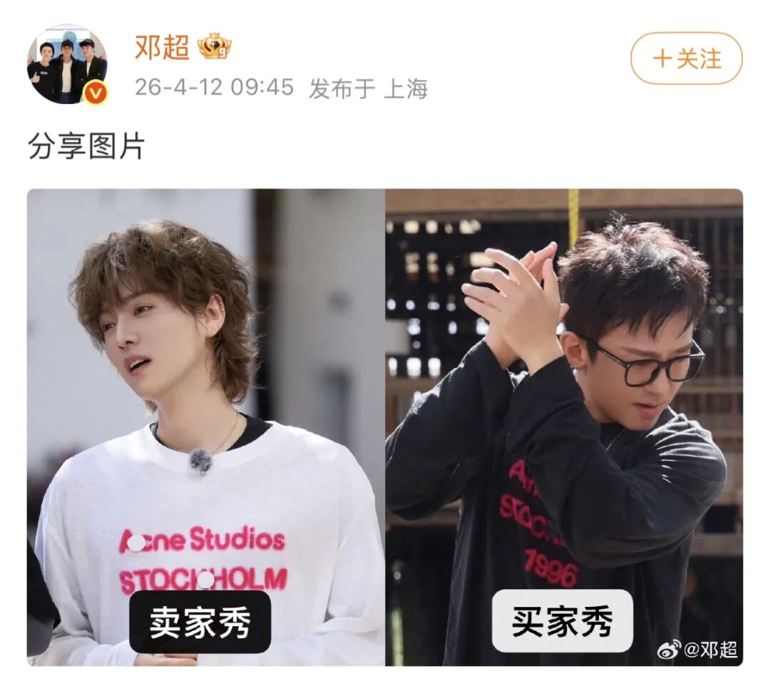 4月12日,演员邓超晒出和鹿晗穿同款衣服的对比照,自嘲是买家秀和卖家秀。