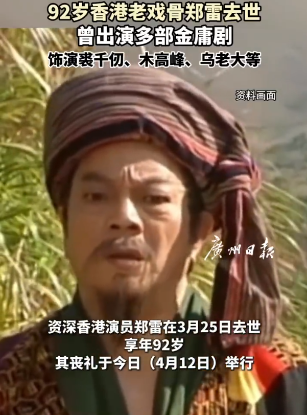 香港知名老戏骨郑雷于2026年3月25日去世,4月12日在香港举办追悼会,享年92岁。