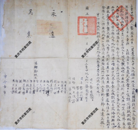这就是重庆市档案馆馆藏中年代最早的一份档案——清雍正三年(1725年)的一份地契,记录了一位名叫龚简在的农民,将祖上传下的一块田地,卖给另一位名叫王杂生的人。