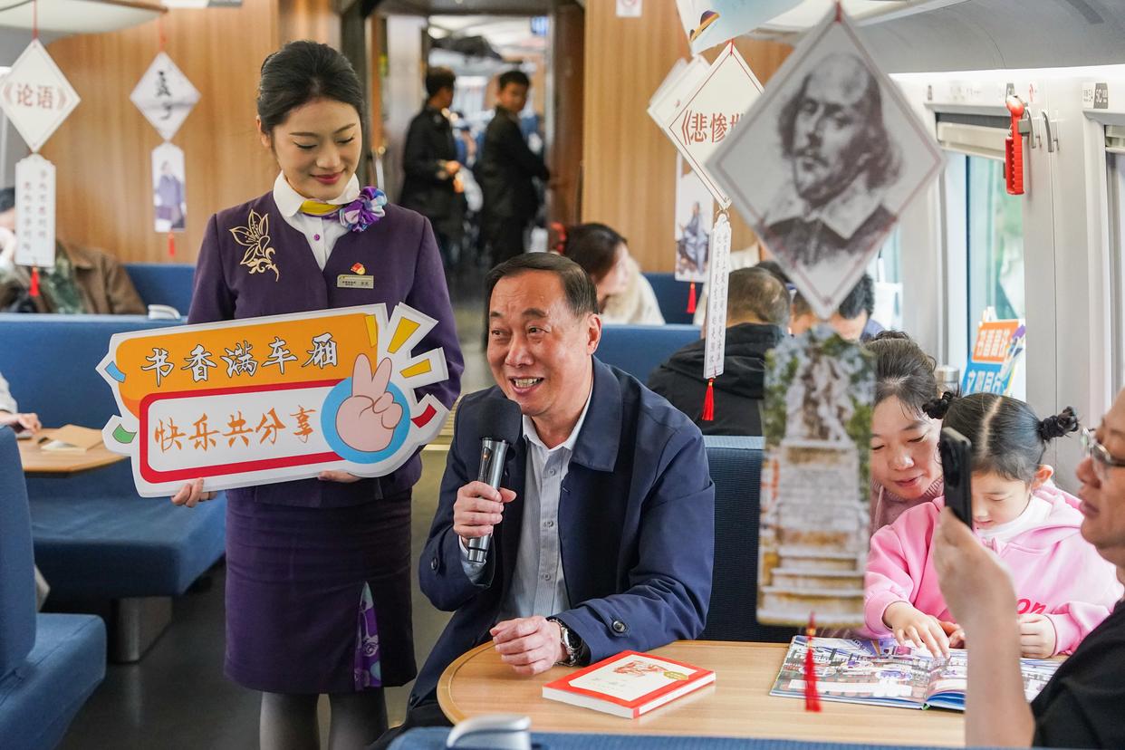 4月20日,旅客在G7378次列车上举行的“书香伴高铁 阅读润旅途”列车阅读会上分享读书心得。新华社记者 杜宇 摄