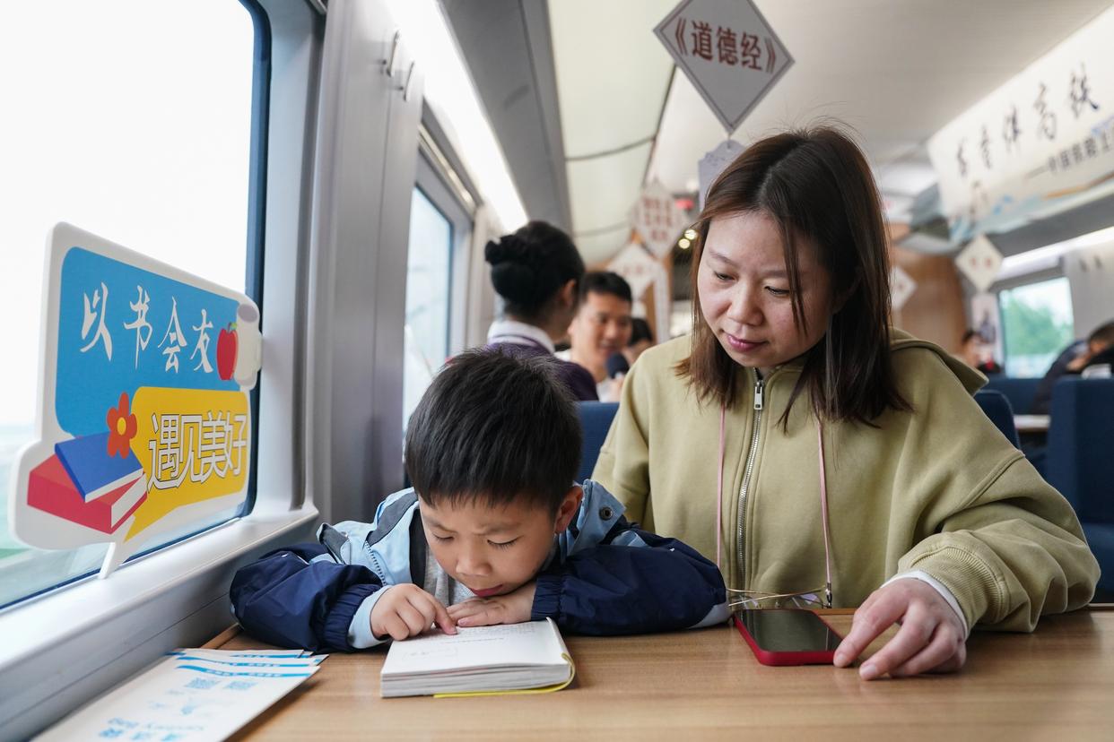4月20日,一名小旅客在G7378次列车上举行的“书香伴高铁 阅读润旅途”列车阅读会上阅读。新华社记者 杜宇 摄