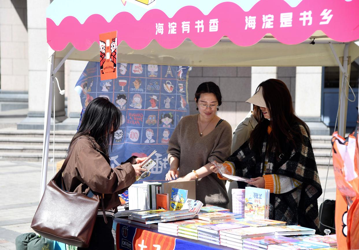 4月20日,在北京大学,学生(左)在“旧书新知·读书育人”活动现场挑选图书。新华社记者 任超 摄