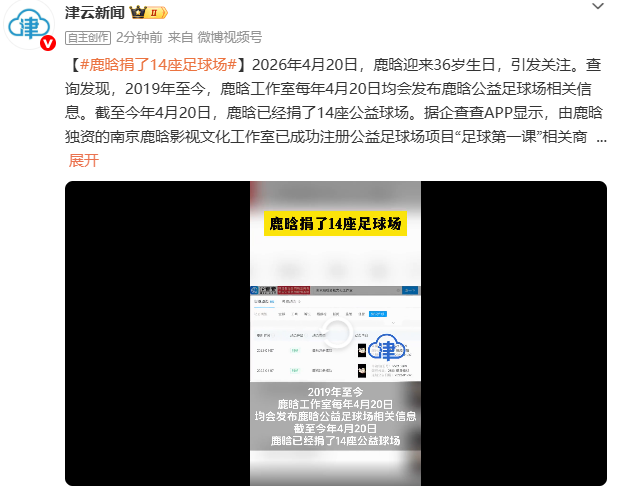 2026年4月20日,鹿晗迎来36岁生日,引发关注。查询发现,2019年至今,鹿晗工作室每年4月20日均会发布鹿晗公益足球场相关信息。截至今年4月20日,鹿晗已经捐了14座公益球场。
