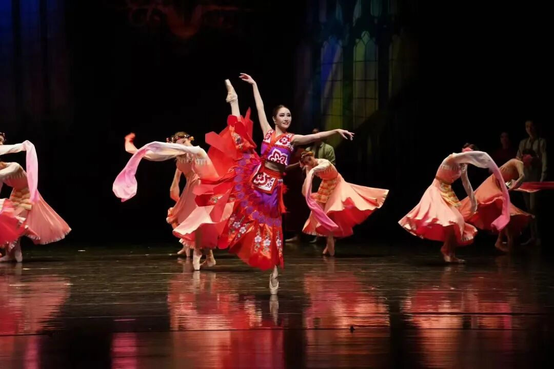 这部舞剧最动人的魅力,在于优雅与力量共生,柔美与风骨并存。它有着古典芭蕾的华彩:足尖轻点,裙摆飞扬,水袖芭蕾、旗袍芭蕾融合东方韵味,更创造性地融入苗族、藏族等民族舞蹈元素,每一个舞姿都如诗如画,宛如流动的画卷,尽显芭蕾艺术的典雅。
