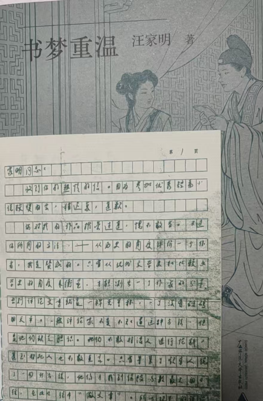 《书梦重温》这本书书封设计别致,独出心裁,利用现代工艺手段,正文设计也是如此,体现浓浓的书卷气。封面为王叔晖绘连环画《西厢记》中的一页,汪家明主政过人民美术出版社,得以见到过这“中国连环画史上的经典之作”的画稿原稿。内封和封底,为灰娃诗稿的手稿。汪家明编过《灰娃七章》,“反复翻阅手稿,那密密麻麻的字和线,红、蓝、黑的笔迹,高高低低插进移出的段落,让我联想到大脑的条条沟壑、秋日林中厚厚层层的落叶,更让我想到作曲家谱写的草稿”。书封之外,将内文中部分图片影印粘贴在书封上,书脊用麻线绞结,书页全用线穿,封面不粘连书本,印成护封式样,随便翻看哪一页,都可平摊着看,真可谓展卷之乐也!