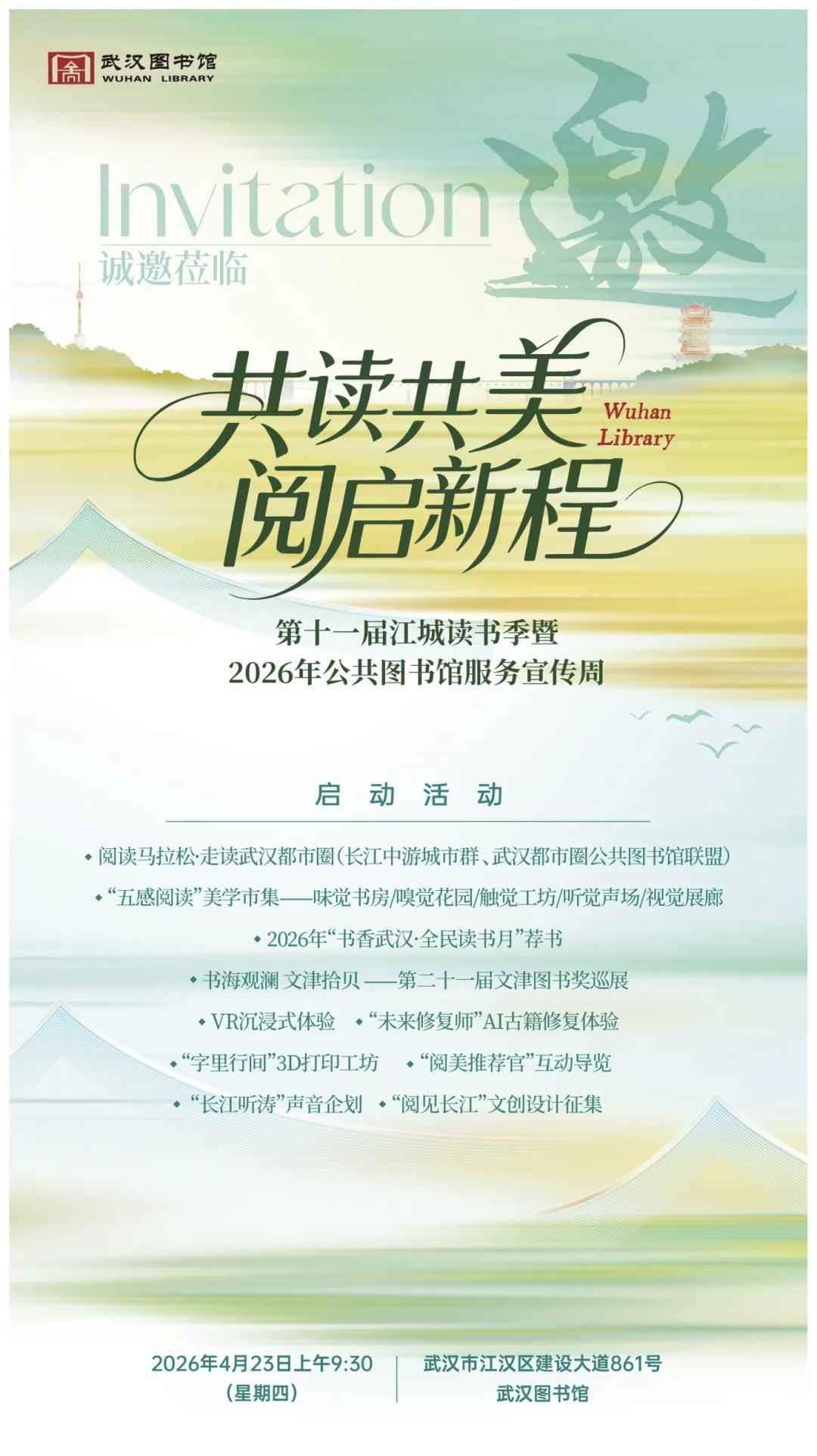 最美人间四月天,正是读书好时节。2026年4月21日至27日是全国公共图书馆服务宣传周,主题为“基层图书馆服务质量提升”。秉承优质文化资源直达基层的核心理念,4月23日,第十一届江城读书季暨2026年公共图书馆服务宣传周将在武汉图书馆拉开帷幕。
