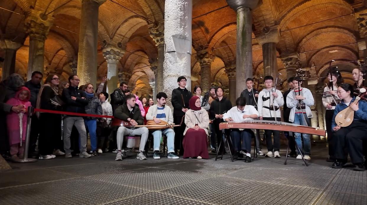 此次表演由南京大学民乐团和土耳其海峡大学的学生共同完成,融合了中国民族乐器、土耳其民族乐器以及西洋乐器的演奏,吸引了众多游客和当地民众驻足观看。