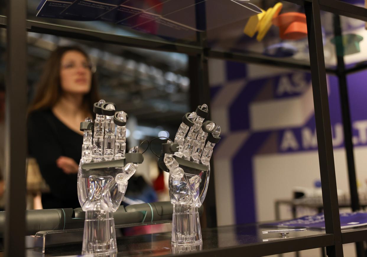 这是4月22日在意大利米兰国际会展中心米兰家具展同济大学展位拍摄的3D打印设计产品。新华社记者 李京 摄