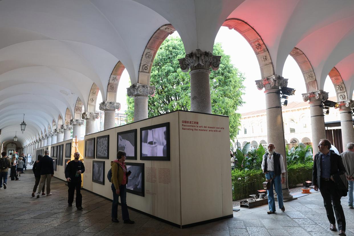 4月20日,在意大利米兰大学,人们在米兰设计周“中国非遗工匠展”参观。新华社记者 李京 摄