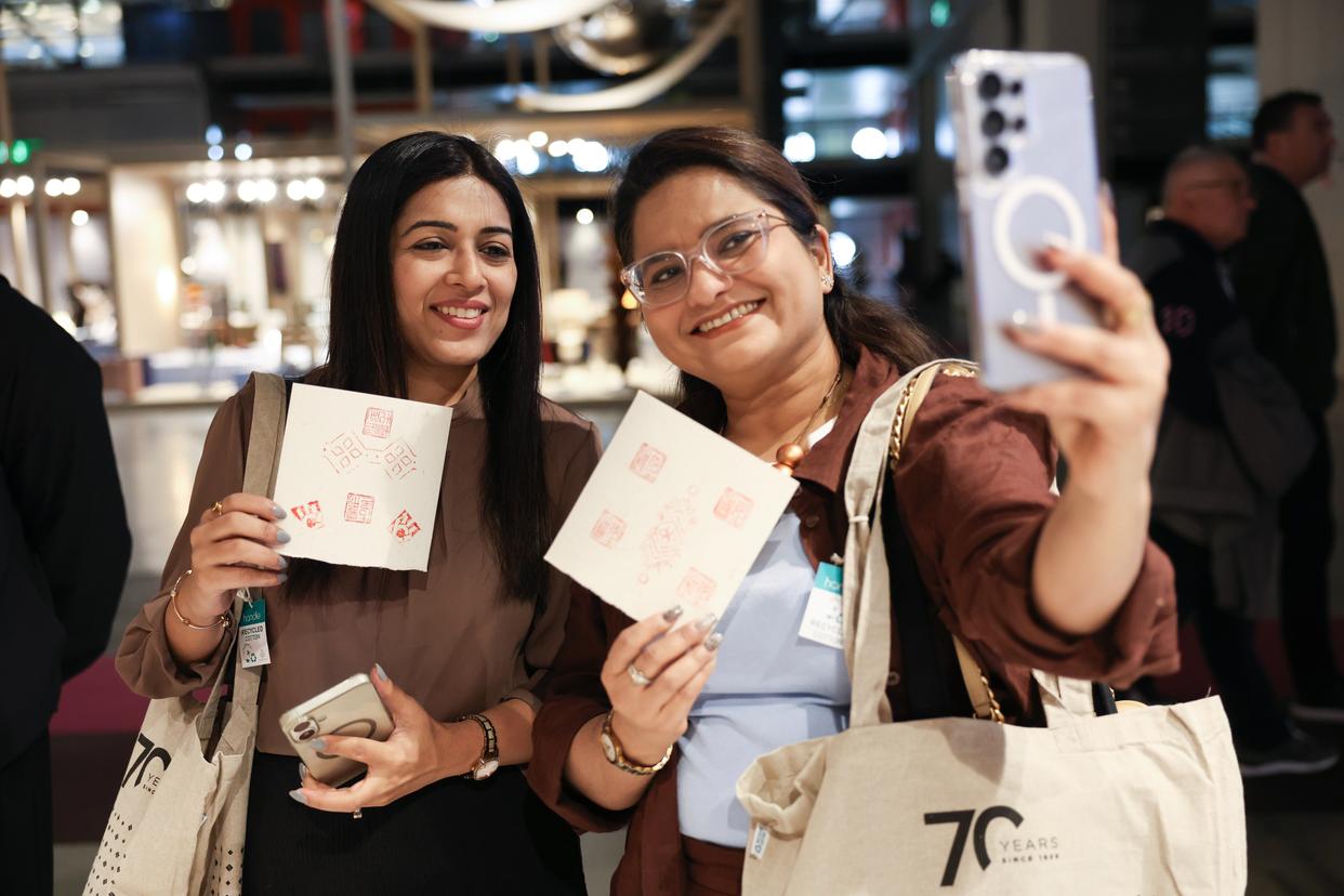 4月22日,在意大利米兰国际会展中心,人们在米兰家具展上与自己使用“鲁庵印泥”制作的图案合影。新华社记者 李京 摄