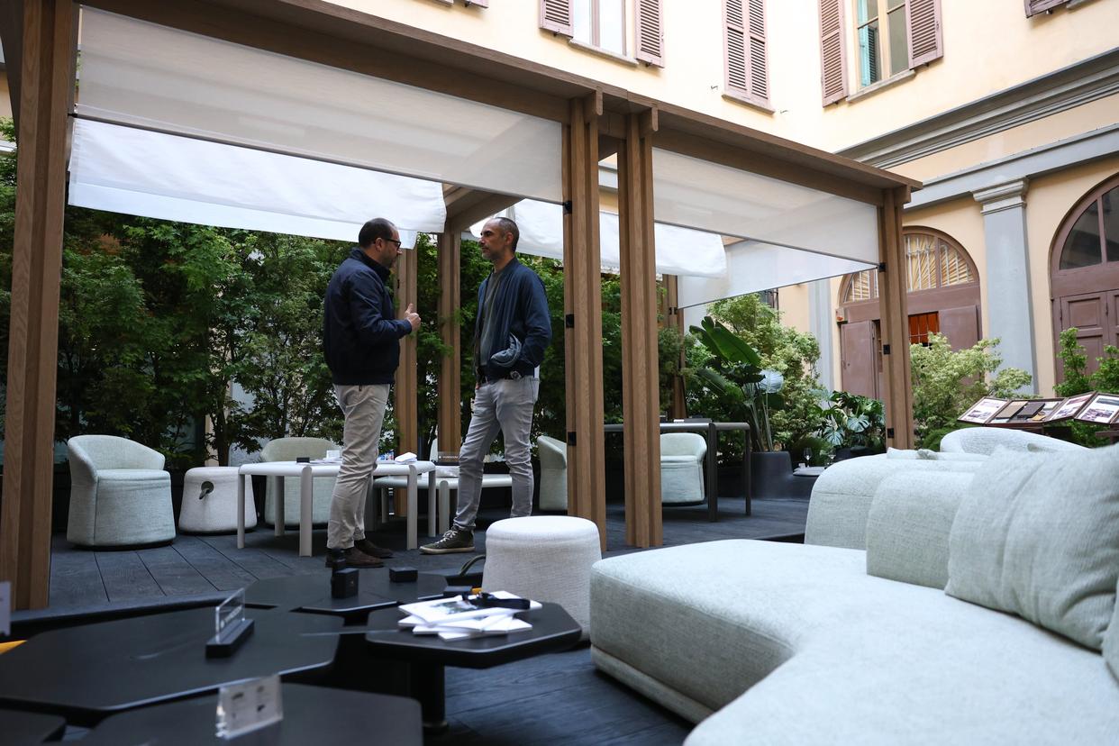 4月22日,在意大利米兰布雷拉区,展商在米兰设计周上了解中国品牌“院半”与香港设计师梁志天联合推出的“山水之境”户外设计方案。新华社记者 李京 摄